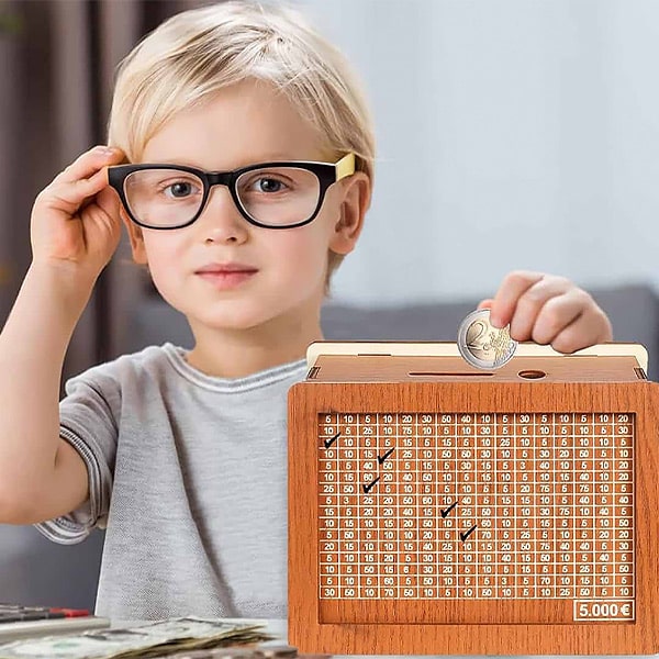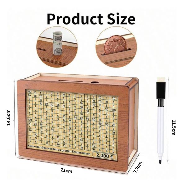 Komplektā: 1 x COINSAVE koka naudas krājkasīte