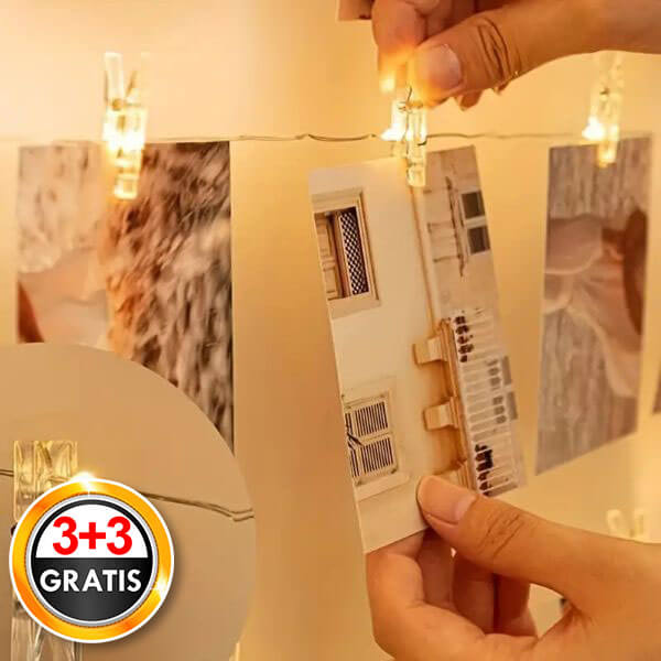 PHOTOGLO ir ideāli piemērots, lai uzlabotu jūsu istabu ar foto atmiņām. Varat noņemt klipšus un dekorēt atsevišķi. Stieples garums ir 3 metri, un, iegādājoties šo ierīci, jūs saņemsiet papildus 3 metrus BEZMAKSAS!